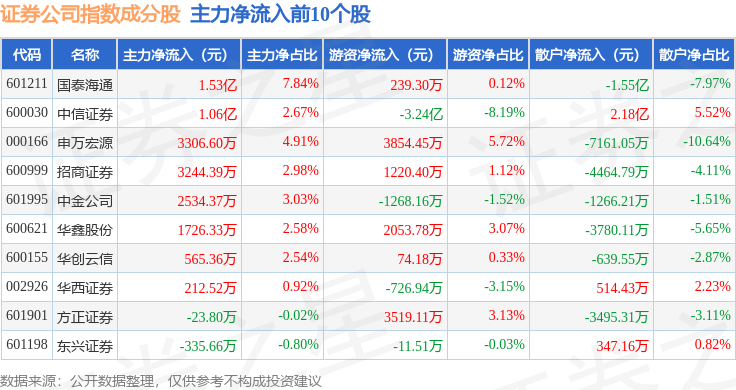 资金流向方面,证券公司(399975)指数成份股当日主力资金净流出合计23.63亿元,游资资金净流入合计9.75亿元,散户资金净流入合计13.88亿元。成份股资金流向详情见下表: