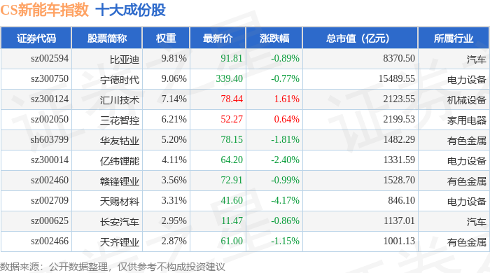 CS新能车(399976)指数十大成份股详情如下: