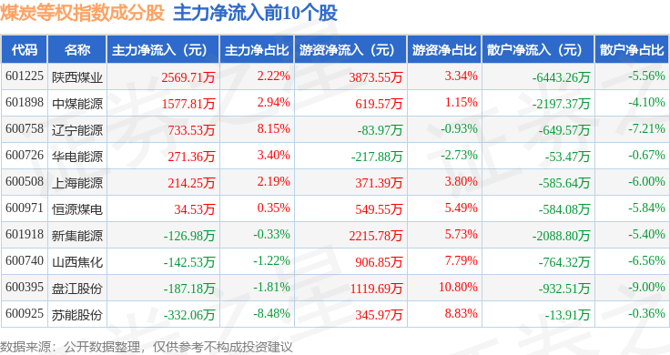 资金流向方面,煤炭等权(399990)指数成份股当日主力资金净流出合计4.78亿元,游资资金净流入合计3.54亿元,散户资金净流入合计1.24亿元。成份股资金流向详情见下表: