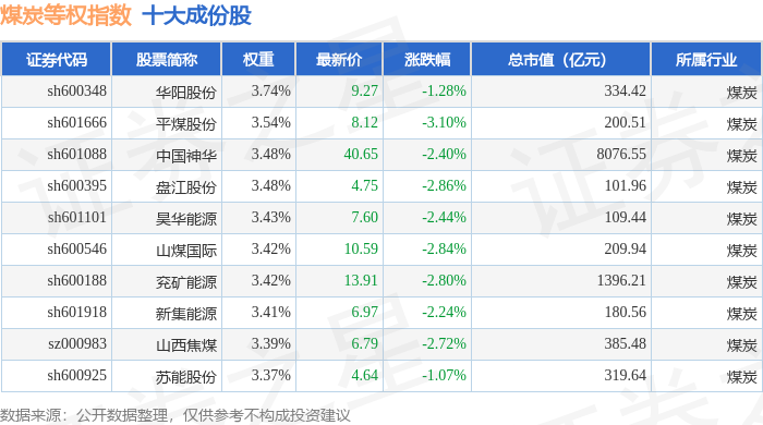 煤炭等权(399990)指数十大成份股详情如下: