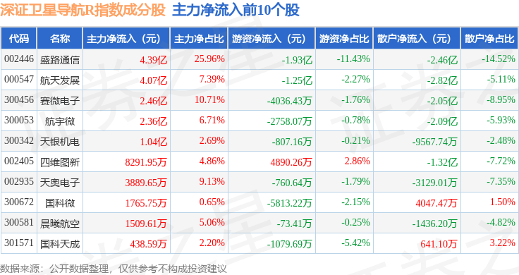资金流向方面,深证卫星导航R(470050)指数成份股当日主力资金净流出合计10.97亿元,游资资金净流入合计2.73亿元,散户资金净流入合计8.24亿元。成份股资金流向详情见下表: