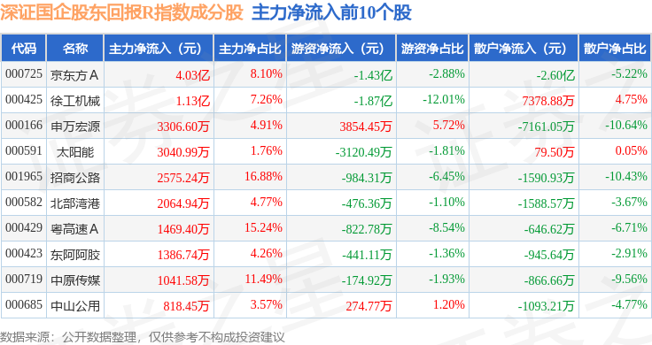 资金流向方面,深证国企股东回报R(470064)指数成份股当日主力资金净流出合计22.84亿元,游资资金净流入合计2.26亿元,散户资金净流入合计20.57亿元。成份股资金流向详情见下表: