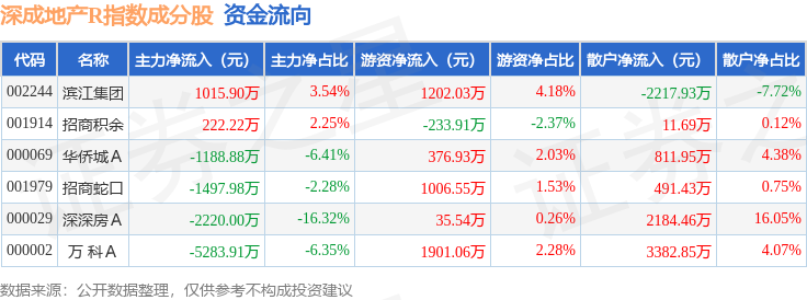 资金流向方面,深成地产R(471001)指数成份股当日主力资金净流出合计8952.64万元,游资资金净流入合计4288.19万元,散户资金净流入合计4664.45万元。成份股资金流向详情见下表: