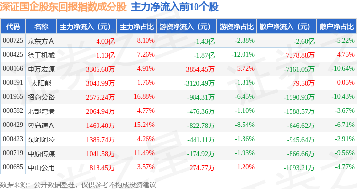 资金流向方面,深证国企股东回报(970064)指数成份股当日主力资金净流出合计22.84亿元,游资资金净流入合计2.26亿元,散户资金净流入合计20.57亿元。成份股资金流向详情见下表: