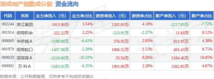 资金流向方面,深成地产(971001)指数成份股当日主力资金净流出合计8952.64万元,游资资金净流入合计4288.19万元,散户资金净流入合计4664.45万元。成份股资金流向详情见下表: