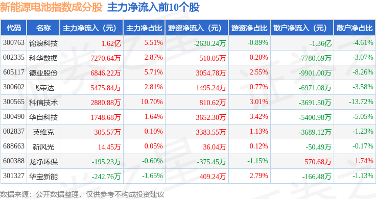 资金流向方面,新能源电池(980027)指数成份股当日主力资金净流出合计28.8亿元,游资资金净流入合计7.88亿元,散户资金净流入合计20.92亿元。成份股资金流向详情见下表: