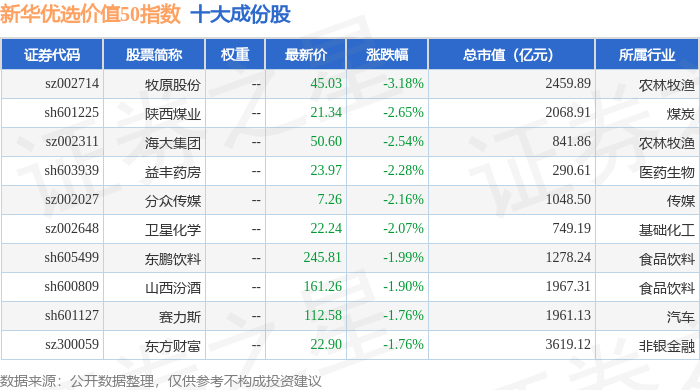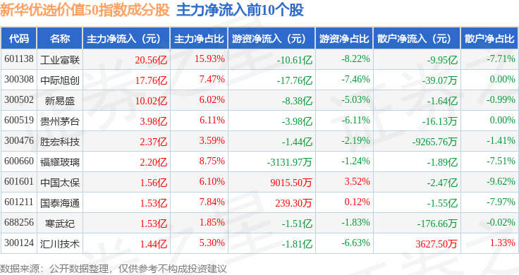 资金流向方面,新华优选价值50(989004)指数成份股当日主力资金净流入合计7.85亿元,游资资金净流出合计34.95亿元,散户资金净流入合计27.11亿元。成份股资金流向详情见下表: