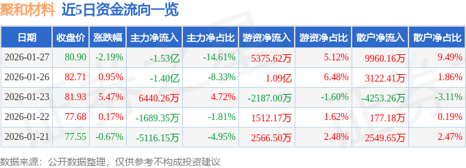 证券之星消息,截至2026年1月27日收盘,聚和材料(688503)报收于80.9元,下跌2.19%,换手率6.49%,成交量13.04万手,成交额10.5亿元。