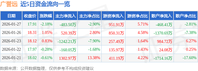 1月27日的资金流向数据方面,主力资金净流出483.5万元,占总成交额2.9%,游资资金净流入951.91万元,占总成交额5.71%,散户资金净流出468.41万元,占总成交额2.81%。