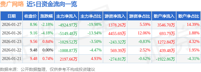 证券之星消息,截至2026年1月27日收盘,贵广网络(600996)报收于8.96元,下跌2.18%,换手率2.2%,成交量27.48万手,成交额2.47亿元。