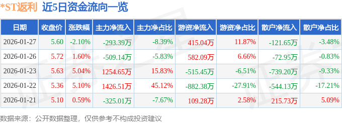 证券之星消息,截至2026年1月27日收盘,*ST返利(600228)报收于5.6元,下跌2.1%,换手率1.49%,成交量6.22万手,成交额3497.94万元。