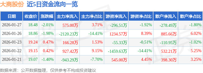 证券之星消息,截至2026年1月27日收盘,大商股份(600694)报收于18.48元,下跌2.01%,换手率2.43%,成交量8.36万手,成交额1.55亿元。