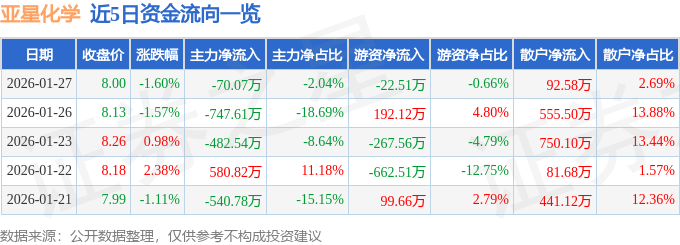 证券之星消息,截至2026年1月27日收盘,亚星化学(600319)报收于8.0元,下跌1.6%,换手率1.11%,成交量4.29万手,成交额3435.69万元。