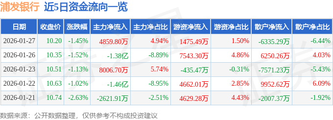 证券之星消息,截至2026年1月27日收盘,浦发银行(600000)报收于10.2元,下跌1.45%,换手率0.29%,成交量95.43万手,成交额9.83亿元。