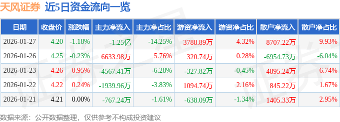 证券之星消息,截至2026年1月27日收盘,天风证券(601162)报收于4.2元,下跌1.18%,换手率2.44%,成交量209.77万手,成交额8.77亿元。