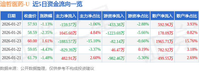 证券之星消息,截至2026年1月27日收盘,迪哲医药(688192)报收于57.93元,下跌1.13%,换手率0.56%,成交量2.59万手,成交额1.51亿元。