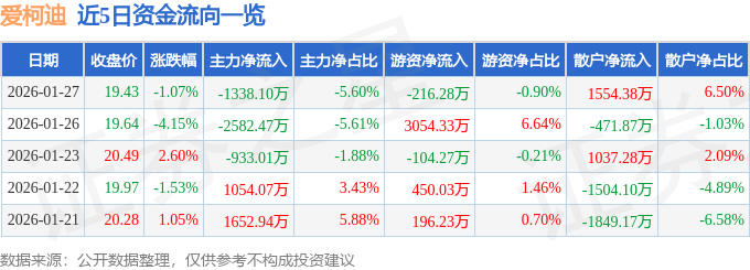 1月27日的资金流向数据方面,主力资金净流出1338.1万元,占总成交额5.6%,游资资金净流出216.28万元,占总成交额0.9%,散户资金净流入1554.38万元,占总成交额6.5%。