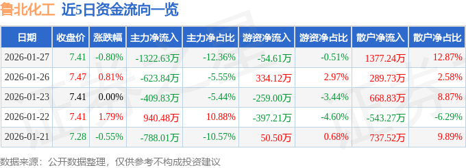 证券之星消息,截至2026年1月27日收盘,鲁北化工(600727)报收于7.41元,下跌0.8%,换手率2.74%,成交量14.46万手,成交额1.07亿元。