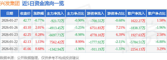 证券之星消息,截至2026年1月27日收盘,兴发集团(600141)报收于42.77元,下跌0.77%,换手率2.19%,成交量24.18万手,成交额10.26亿元。