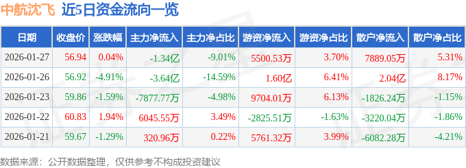 证券之星消息,截至2026年1月27日收盘,中航沈飞(600760)报收于56.94元,上涨0.04%,换手率0.92%,成交量26.04万手,成交额14.86亿元。