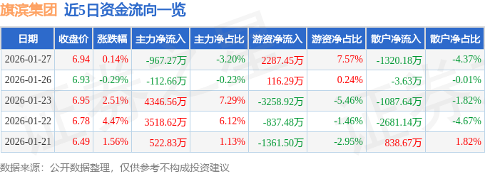 证券之星消息,截至2026年1月27日收盘,旗滨集团(601636)报收于6.94元,上涨0.14%,换手率1.48%,成交量43.71万手,成交额3.02亿元。