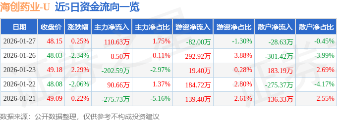 证券之星消息,截至2026年1月27日收盘,海创药业(688302)报收于48.15元,上涨0.25%,换手率1.34%,成交量1.33万手,成交额6314.11万元。