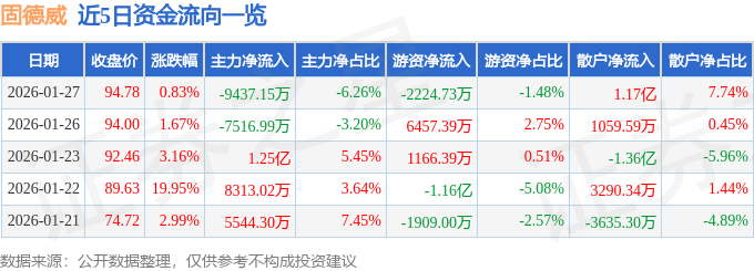 证券之星消息,截至2026年1月27日收盘,固德威(688390)报收于94.78元,上涨0.83%,换手率6.71%,成交量16.3万手,成交额15.07亿元。