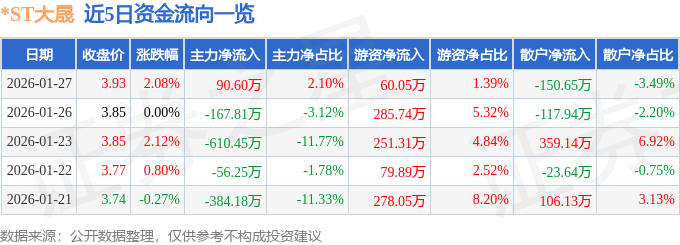 证券之星消息,截至2026年1月27日收盘,*ST大晟(600892)报收于3.93元,上涨2.08%,换手率1.98%,成交量11.06万手,成交额4319.94万元。