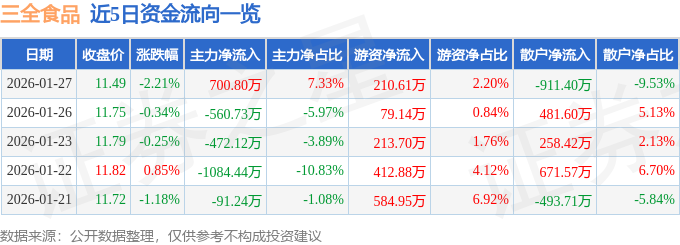 证券之星消息,截至2026年1月27日收盘,三全食品(002216)报收于11.49元,下跌2.21%,换手率1.32%,成交量8.3万手,成交额9560.77万元。