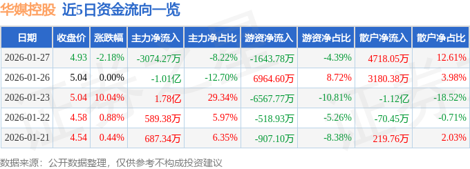 证券之星消息,截至2026年1月27日收盘,华媒控股(000607)报收于4.93元,下跌2.18%,换手率8.59%,成交量76.05万手,成交额3.74亿元。