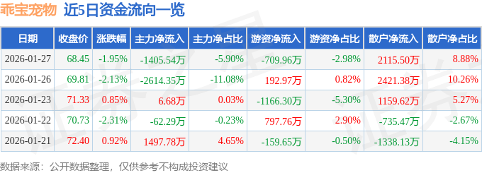 证券之星消息,截至2026年1月27日收盘,乖宝宠物(301498)报收于68.45元,下跌1.95%,换手率1.95%,成交量3.49万手,成交额2.38亿元。