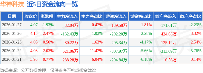 证券之星消息,截至2026年1月27日收盘,华神科技(000790)报收于4.07元,下跌1.93%,换手率3.05%,成交量18.98万手,成交额7690.47万元。