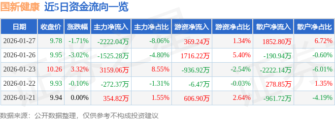证券之星消息,截至2026年1月27日收盘,国新健康(000503)报收于9.78元,下跌1.71%,换手率2.9%,成交量28.4万手,成交额2.76亿元。