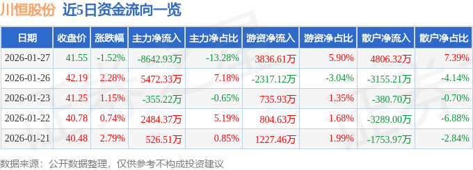 证券之星消息,截至2026年1月27日收盘,川恒股份(002895)报收于41.55元,下跌1.52%,换手率2.63%,成交量15.67万手,成交额6.51亿元。