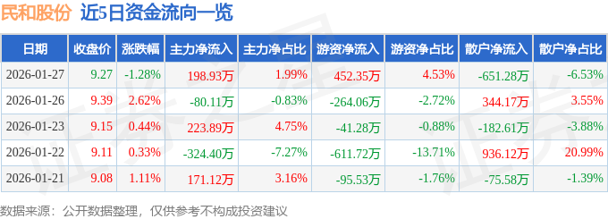 证券之星消息,截至2026年1月27日收盘,民和股份(002234)报收于9.27元,下跌1.28%,换手率3.54%,成交量10.68万手,成交额9979.23万元。