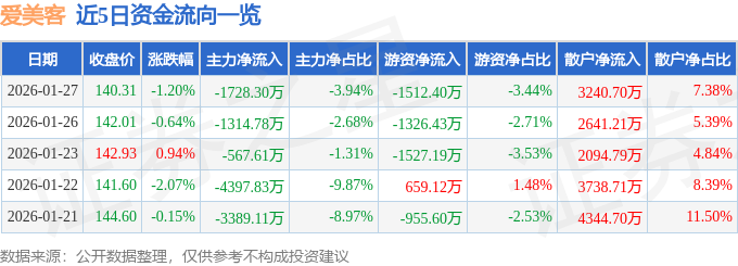1月27日的资金流向数据方面,主力资金净流出1728.3万元,占总成交额3.94%,游资资金净流出1512.4万元,占总成交额3.44%,散户资金净流入3240.7万元,占总成交额7.38%。