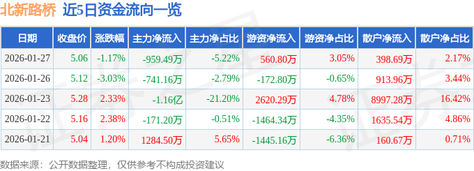 证券之星消息,截至2026年1月27日收盘,北新路桥(002307)报收于5.06元,下跌1.17%,换手率2.88%,成交量36.48万手,成交额1.84亿元。