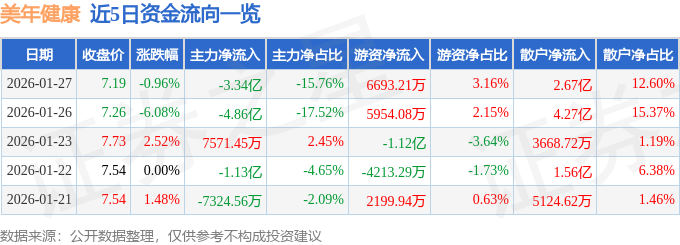 证券之星消息,截至2026年1月27日收盘,美年健康(002044)报收于7.19元,下跌0.96%,换手率7.67%,成交量297.05万手,成交额21.21亿元。