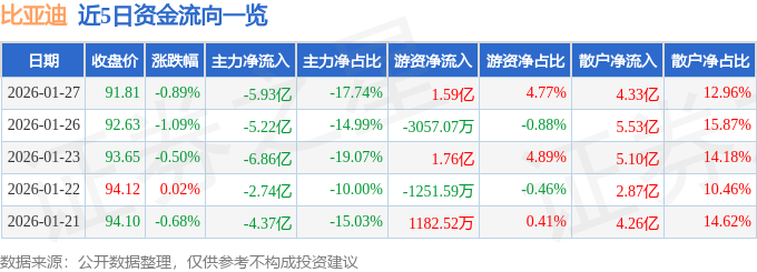 证券之星消息,截至2026年1月27日收盘,比亚迪(002594)报收于91.81元,下跌0.89%,换手率1.04%,成交量36.3万手,成交额33.41亿元。