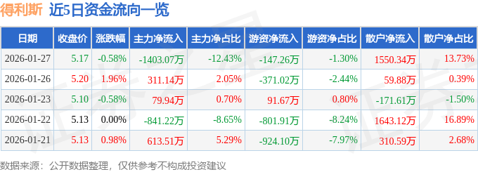 证券之星消息,截至2026年1月27日收盘,得利斯(002330)报收于5.17元,下跌0.58%,换手率3.46%,成交量22.0万手,成交额1.13亿元。