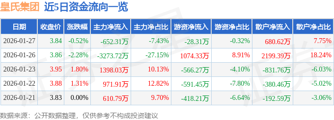 证券之星消息,截至2026年1月27日收盘,皇氏集团(002329)报收于3.84元,下跌0.52%,换手率3.55%,成交量23.1万手,成交额8777.83万元。