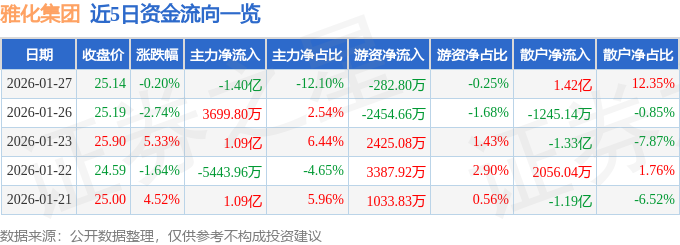 证券之星消息,截至2026年1月27日收盘,雅化集团(002497)报收于25.14元,下跌0.2%,换手率4.41%,成交量46.66万手,成交额11.53亿元。