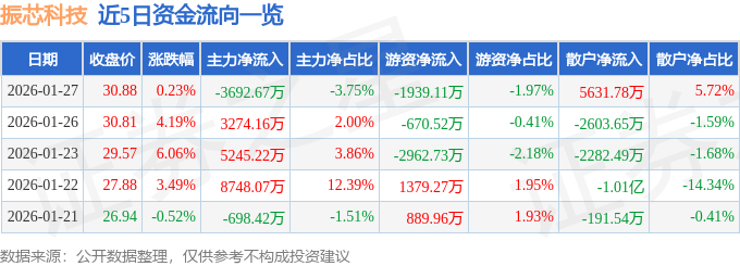 证券之星消息,截至2026年1月27日收盘,振芯科技(300101)报收于30.88元,上涨0.23%,换手率5.69%,成交量32.23万手,成交额9.85亿元。