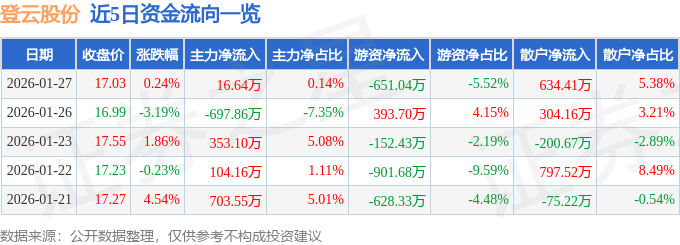 证券之星消息,截至2026年1月27日收盘,登云股份(002715)报收于17.03元,上涨0.24%,换手率5.11%,成交量7.06万手,成交额1.18亿元。