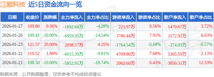 证券之星消息,截至2026年1月27日收盘,江顺科技(001400)报收于109.8元,上涨0.36%,换手率24.07%,成交量3.61万手,成交额3.95亿元。