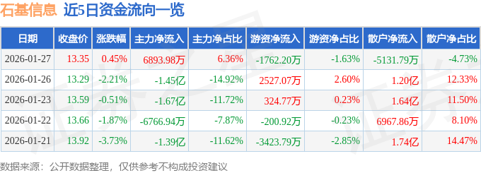 证券之星消息,截至2026年1月27日收盘,石基信息(002153)报收于13.35元,上涨0.45%,换手率5.17%,成交量82.73万手,成交额10.84亿元。