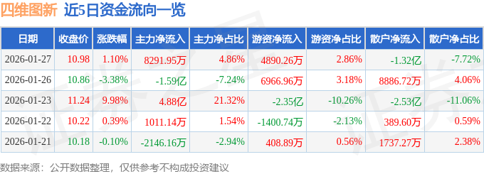 证券之星消息,截至2026年1月27日收盘,四维图新(002405)报收于10.98元,上涨1.1%,换手率6.58%,成交量154.98万手,成交额17.07亿元。