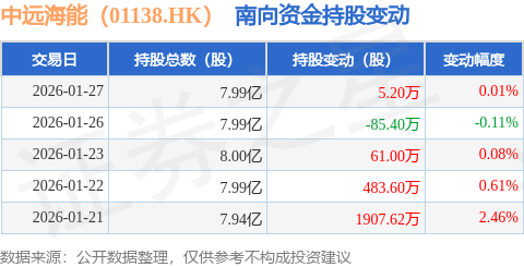 证券之星消息,1月27日南向资金增持5.2万股中远海能(01138.HK)。近5个交易日中,获南向资金增持的有4天,累计净增持2372.02万股。近20个交易日中,获南向资金减持的有10天,累计净减持3216.64万股。截至目前,南向资金持有中远海能(01138.HK)7.99亿股,占公司已发行普通股的61.63%。