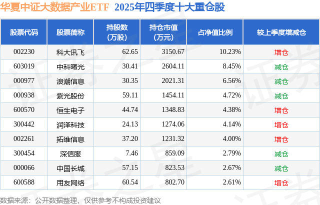 华夏中证大数据产业ETF基金成立于2021年2月9日,基金经理为司帆,基金跟踪标的为中证大数据产业指数,成立以来超额回报为7.85%,近一个月超额回报为0.08%。最新披露的基金持仓数据显示,截止2025年12月31日,该基金第一大重仓股为科大讯飞(002230),持股占比为10.23%。