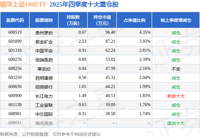 银华上证180ETF基金成立于2025年1月17日,基金经理为王帅,基金跟踪标的为上证180指数,成立以来超额回报为1.55%,近一个月超额回报为0.03%。最新披露的基金持仓数据显示,截止2025年12月31日,该基金第一大重仓股为贵州茅台(600519),持股占比为4.35%。